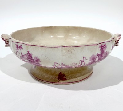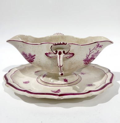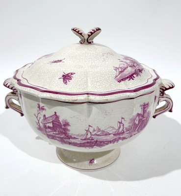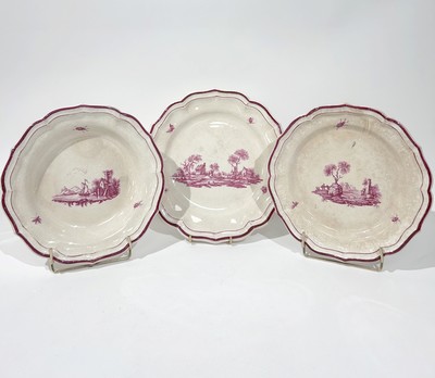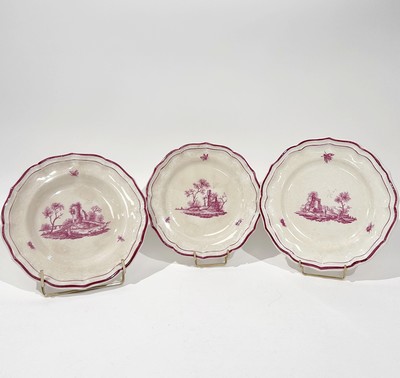 SERVICE en faïence fine à décor en camaïeu rose de paysages de campagne au centre et insectes autour avec filets, comprenant 33 pièces, soit :
