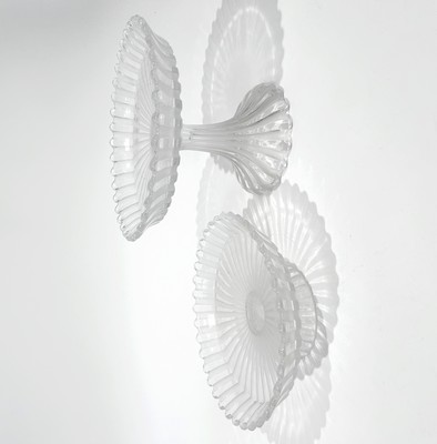 TROIS PLATS A GATEAUX en cristal moulé à haut piédouche à bords godronnés et à décor translucide et opaque.