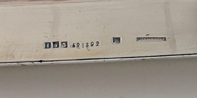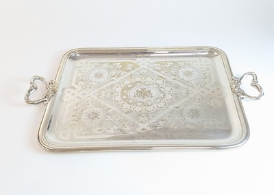 GRAND PLATEAU en métal argenté, à riche décor gravé de rinceaux et fleurs dans des filets croisés, le centre avec armoiries d'alliance sous couronne comtale flanquées de lion, les anses simulants des branchages.