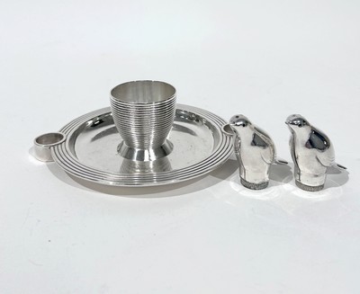 COQUETIER en métal argenté sur dormant avec salière-poivrière en oiseau.