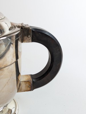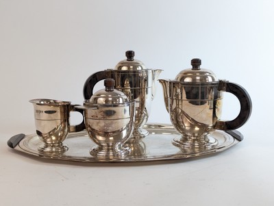 SERVICE A THÉ-CAFÉ en maillechort et prises en palissandre à décor annelé, comprenant : une théière, une cafetière, un sucrier, un pot à lait et un plateau ovale.