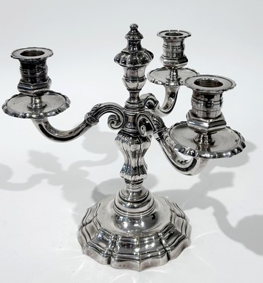 PAIRE DE CANDELABRES ou BOUTS DE TABLE, à trois bras de lumière en bronze argenté.