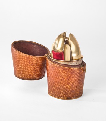 NÉCESSAIRE A PIQUE-NIQUE dans son étui en cuir de forme tonneau, découvrant diverses pièces en vermeil (950) dont couvert pliant et petite cuillère ciselés de rinceaux et croisillons et une timbale par ODIOT, un tire-bouchon et un étui cylindrique à deux compartiments et un saleron vissé par Eugène MICHAUT, et deux canifs à lame...