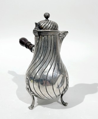 VERSEUSE en argent (950) à panse torsadée et à manche latéral en bois tourné reposant sur trois pieds en enroulement.