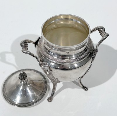 SUCRIER COUVERT de forme balustre en argent (950) à quatre pieds griffes et deux anses à agrafes de palmettes.