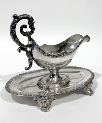 SAUCIERE casque, sur présentoir, en argent (950) à anse, quatre pieds et bordure feuillagés rocaille.