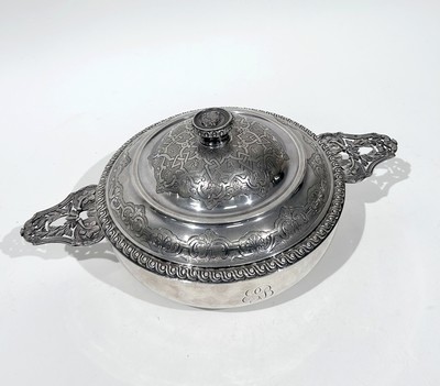BOUILLON COUVERT A OREILLES en argent (950) gravé et ciselé à décor sur le couvercle de motifs d'agrafes, entrelacs et acanthes. Les prises ajourées à décor de fleurs de lys au naturel et d'acanthes.