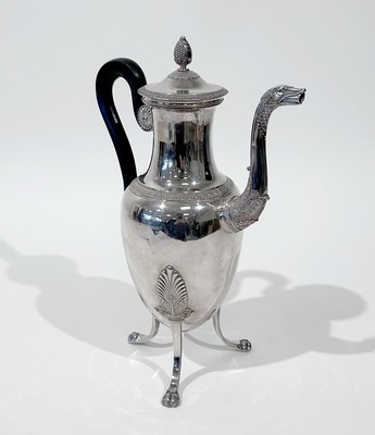 GRANDE VERSEUSE en argent (950) de forme balustre à trois pieds en griffes de lion, et décor de frises de palmettes, le bec verseur en dragon, anse en bois noirci.
