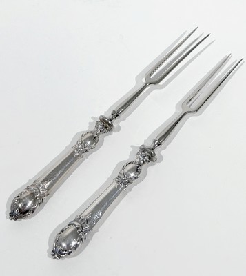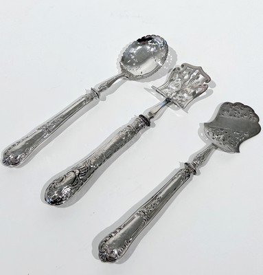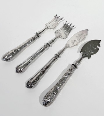 ENSEMBLE DE PIECES DE SERVICE A HORS D'OEUVRE, manches en argent fourré, lames et cuillerons en métal, comprenant :