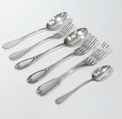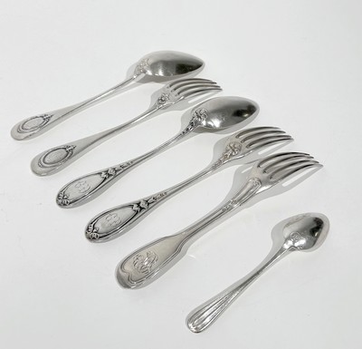 ENSEMBLE DE COUVERTS en argent (950), comprenant : cinq grandes cuillères et cinq grandes fourchettes modèle uniplat à médaillon chiffré, un couvert à chute de fleurs, deux petites cuillères et une fourchette (vieillard).
