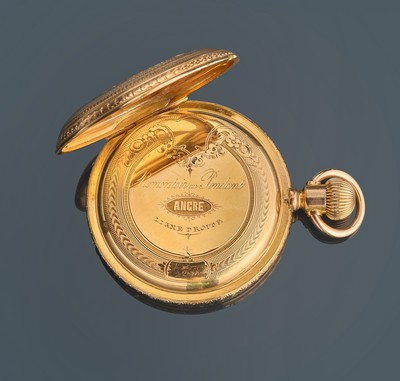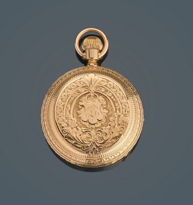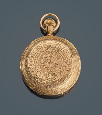 MONTRE A GOUSSET en or (750) à couvercle et cache-poussière en or (750) à décor ciselé de fleurs entrelacées dans une réserve conscrite de quatre cercles concentriques sur chaque couvercle. Le revers chiffré "LP".