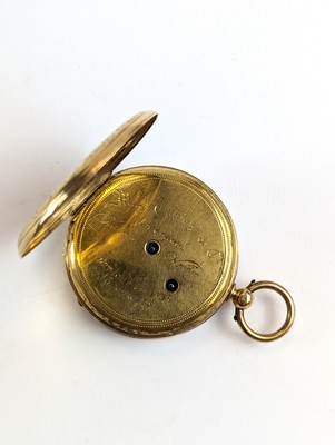 MONTRE DE POCHE en or (750), cache poussière en cuivre, à décor gravé d'une course de chevaux