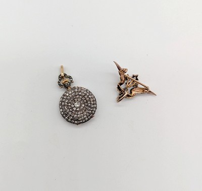 MONTRE DE COL ET SA BROCHE en or (750) et argent (950), la broche en forme de roue aillée à pavage d'éclats de diamants, la montre pavée de diamants en rose sur nid d'abeille, cache poussière en argent. Mouvement mécanique signé Seeland Watch Co. Bélière en or (750).