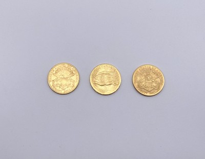 TROIS PIECES DE 20 DOLLARS or, Liberty 1877 et 1904 et Saint-Gaudens 1908.