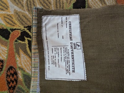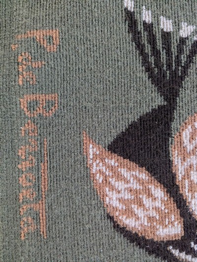 Epreuve en laine polychrome à décor imprimé signée en bas à gauche, avec bolduc au dos.