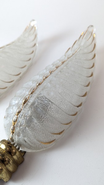 PAIRE D'APPLIQUES en verre moulé pressé granulé, en forme de feuille à rehauts or, monture en bronze.