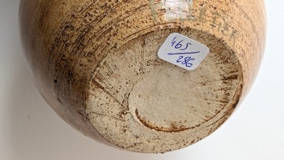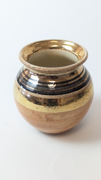 VASE balustre en faïence émaillée brun orangé à filets or, cuivré et argenté sur fond beige.