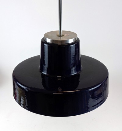 SUSPENSION en céramique émaillée bleue dit de Sèvres de forme circulaire à haut col tubulaire. L'intérieur peint en blanc après cuisson. Gaine en métal chromé.