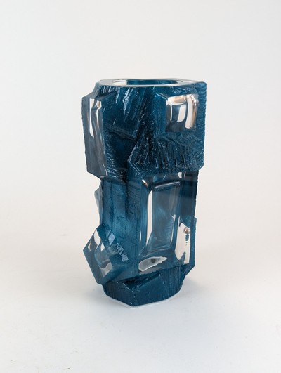 VASE modèle "Argos" en cristal moulé pressé teinté bleu. Signé.