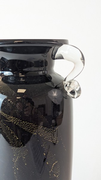 VASE balustre à deux anses en verre soufflé teinté mauve et pailleté or. Etiquette LANCEL Paris.