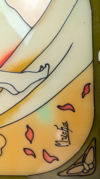 DEUX PLAQUES en verre granité et émaillée polychrome, à l'imitation du vitrail, représentant les allégories des Arts et du Vent. Une plaque signée.